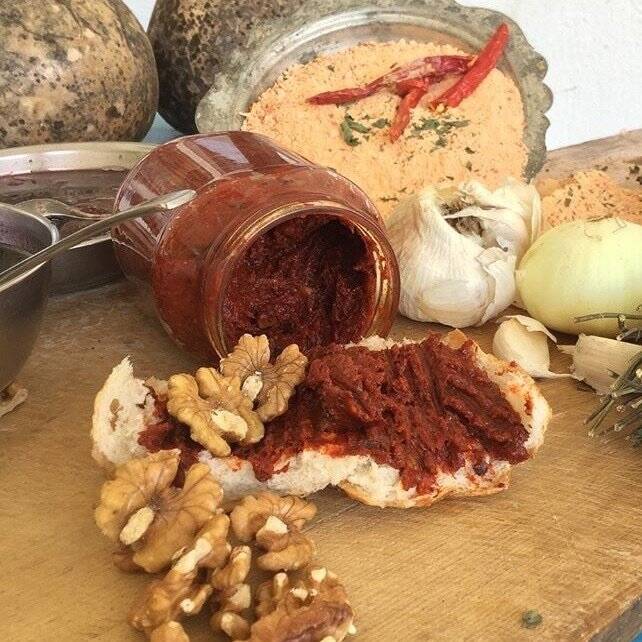Ev yapımı acı ve tatlı biber salçası, domates salçası, galeta unu , çeşitli baharatlar, bol bol sarımsak ve parça ceviz ile hazırlanan kahvaltılık sostur.